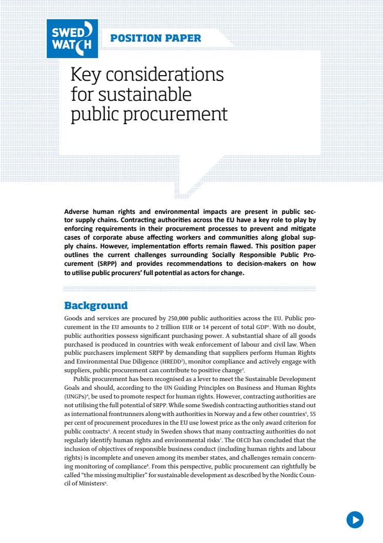 Attached is Swedwatch´s postion paper "Key consideration for sustainable public procurement". (An updated version will be launched shortly).